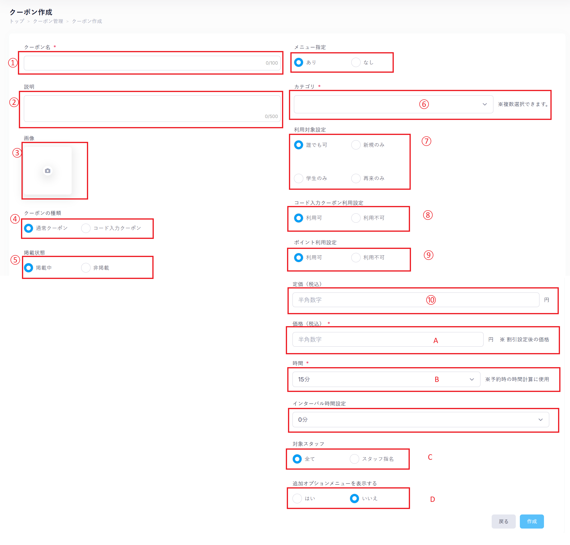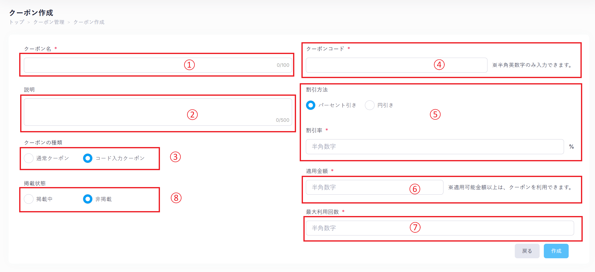 ⑧・・・コード入力クーポンが利用できるか選択します。 コード入力クーポンの詳細は下記に記載しています。