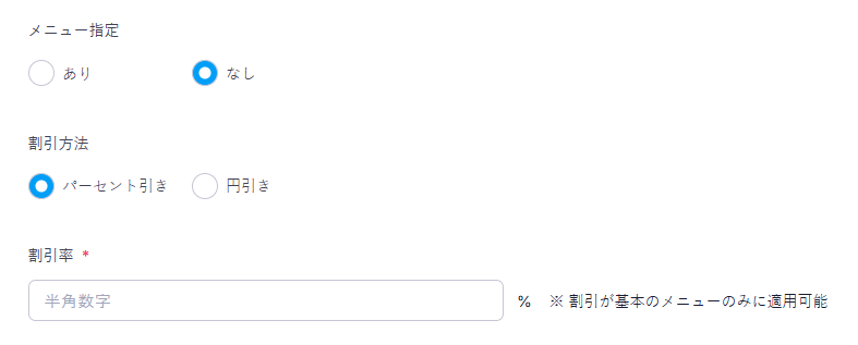 金額をメニュー指定なしを選択すると図のように割引金額を決めれます。 単品メニューか組み合わせメニューから割引するか決めます。 例えば、メニュー指定なしで20%割引クーポンを作成します。お客様がこの作成したクーポンを選択したら、もう一つメニューを選択するようになります。その他に追加するメニューなどが割引対象となります。