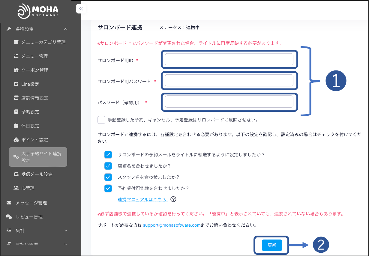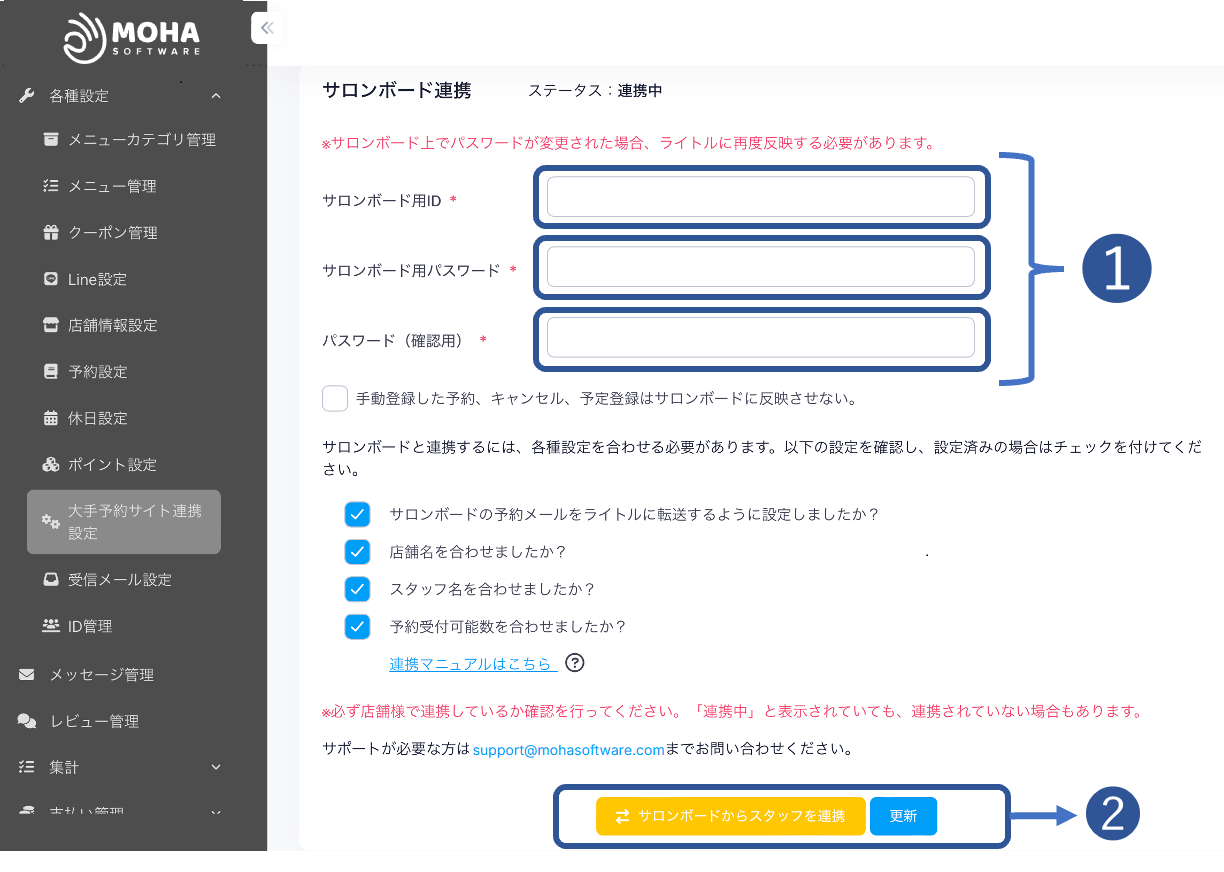 ・再度、各種設定→大手予約サイト連携設定で、サロンボードID・パスワードを入力して下さい。