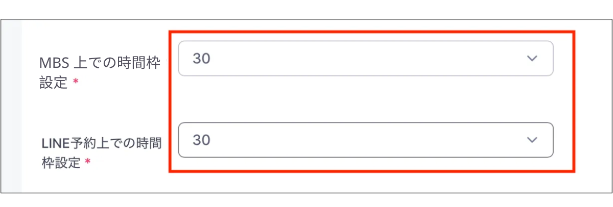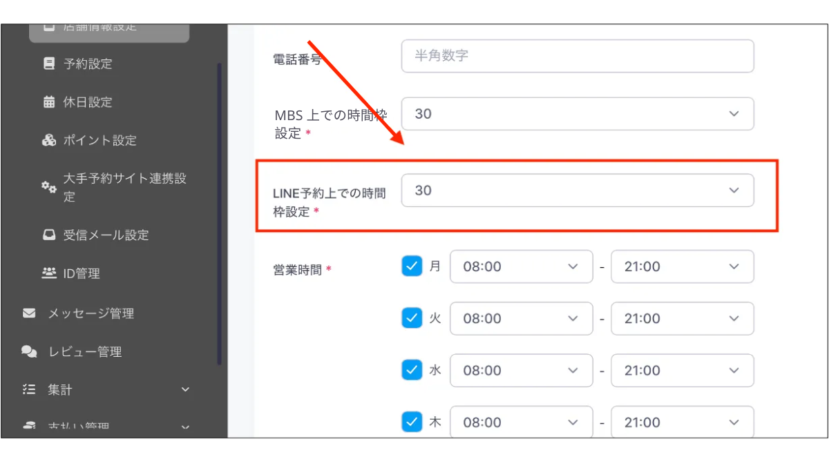 ②・・・HOT PEPPER Beauty上での予約受付単位設定をMBSの「メニューバー」→「各種設定」→「店舗情報設定」の中にある「LINE予約上での時間枠設定」を同じ時間に設定して下さい。(下記の画像を参照して下さい)