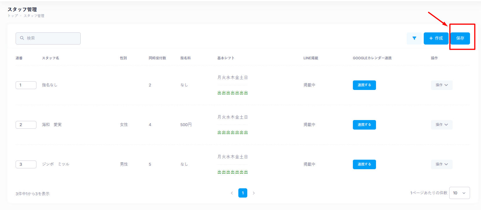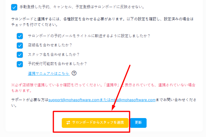 すると↓の「サロンボードからスタッフを連携」が表示されますのでクリックすると自動でスタッフ名が連携されます。