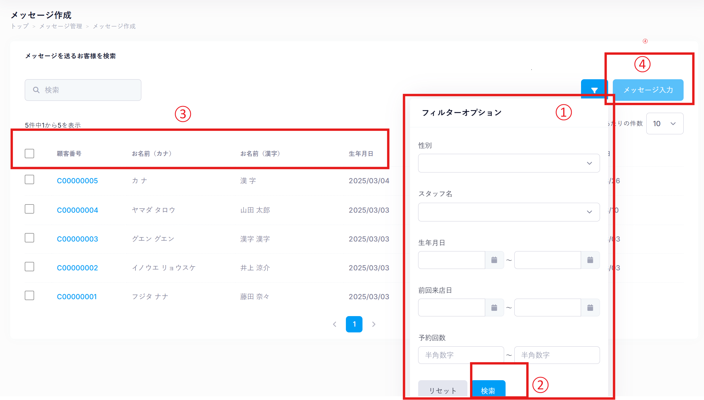 - メッセージを送りたいお客様を選び検索します。