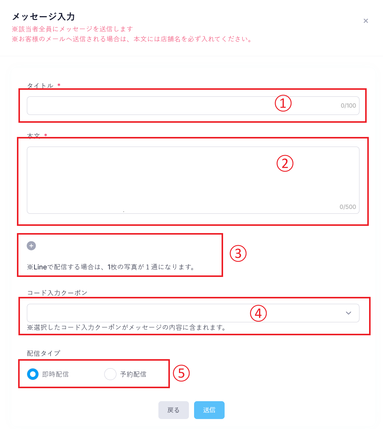 ⑤・・・即時配信するか予約配信するか選択します。