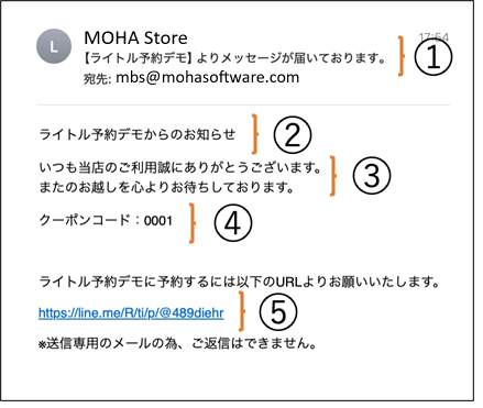 ◎メールで顧客にメッセージを送る場合は、mbs@mohasoftware.com ←こちらのメールアドレスより送信されます 。メール内容には店舗名が自動で記載されます。