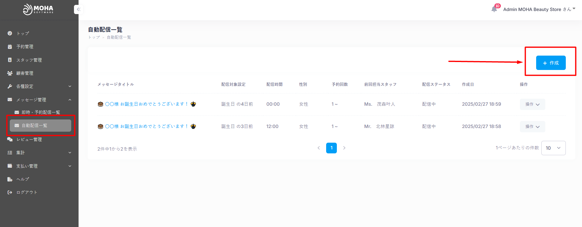 ◎メニューバーにあるメッセージ管理をクリックし、自動配信一覧をクリックし、「自動配信設定作成」をクリックします。